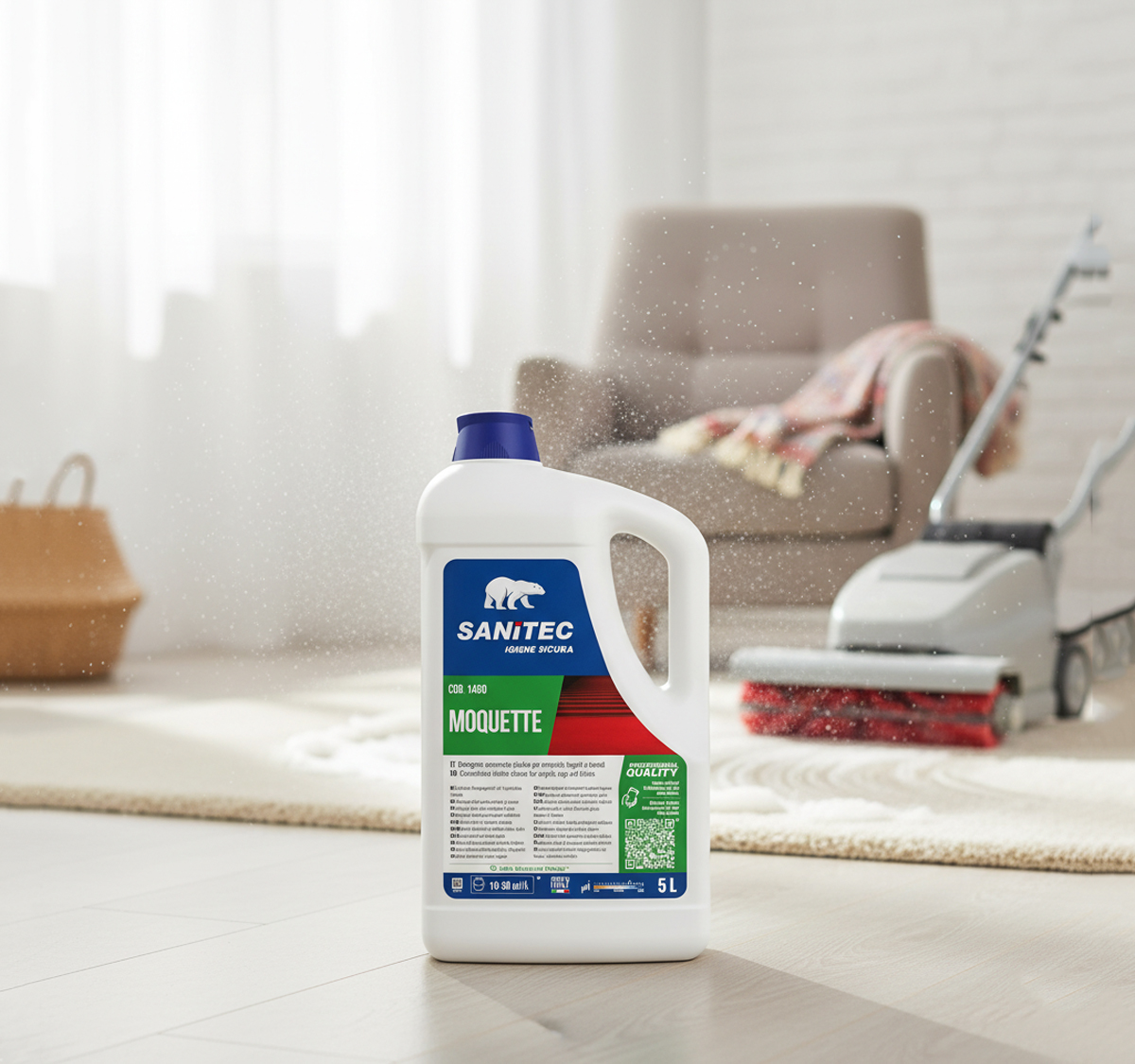 Fragranced cleaning solution for carpets, rugs, and textiles using an injection/extraction machine. Cleans deep down also eliminating the most stubborn dirt while being gentle on fibres and textiles.