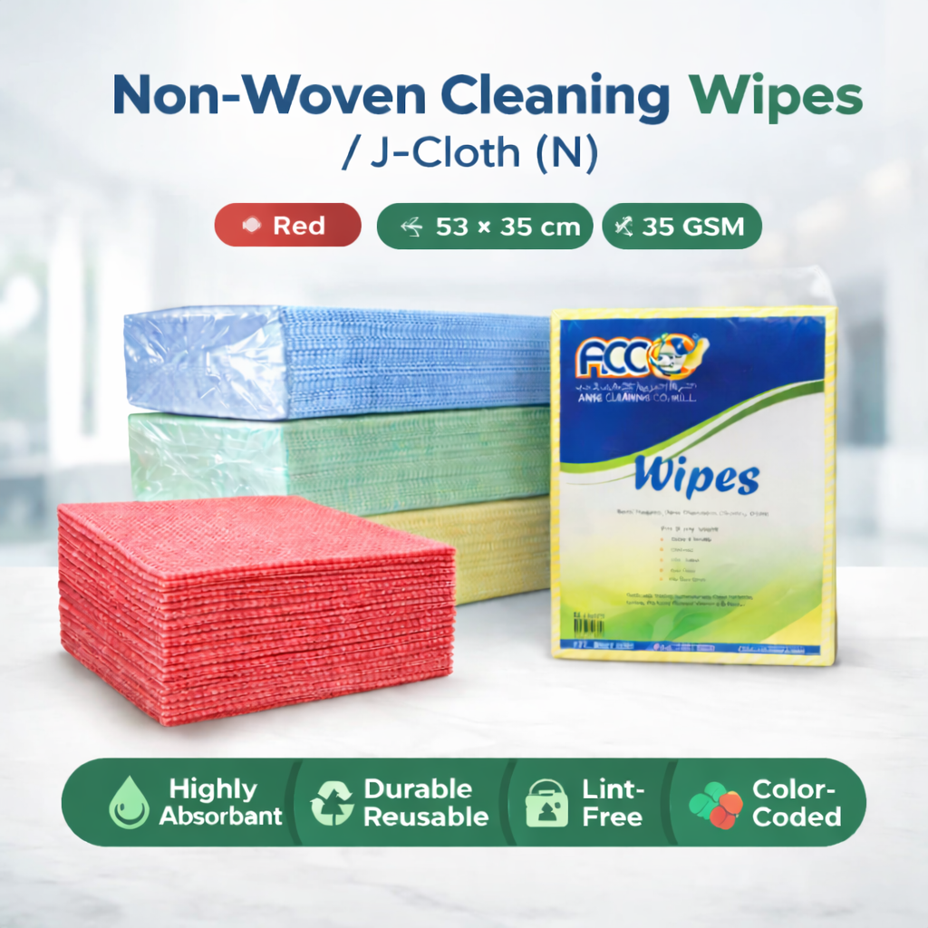 Non-Woven Cleaning Wipes (J-Cloth N – Yellow) are high-quality, reusable cleaning cloths designed for commercial and industrial cleaning applications. Made from durable non-woven material, these wipes provide excellent absorbency, strength, and lint-free performance, making them ideal for daily cleaning tasks.