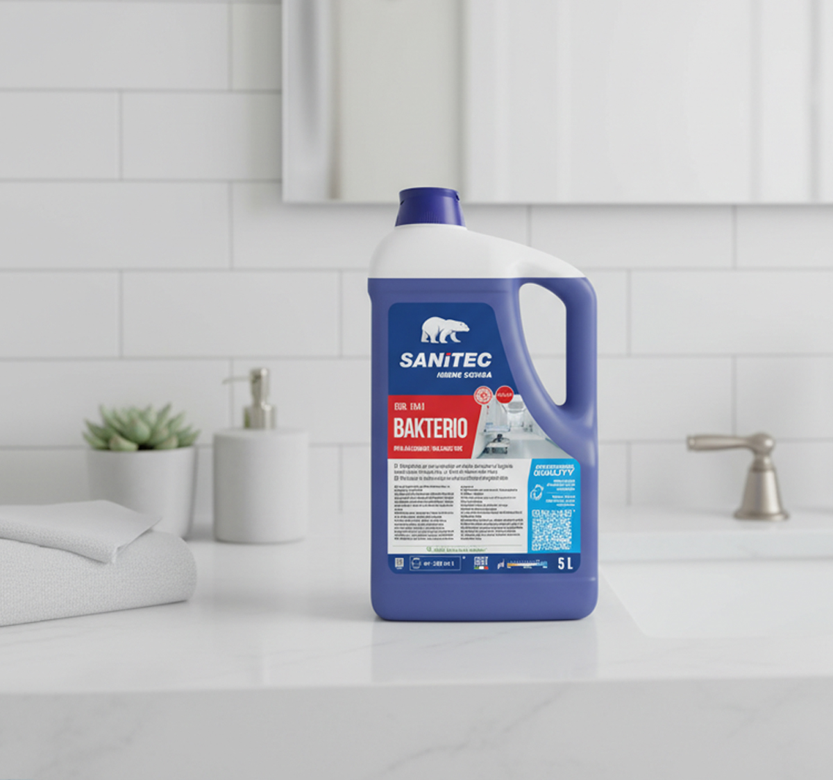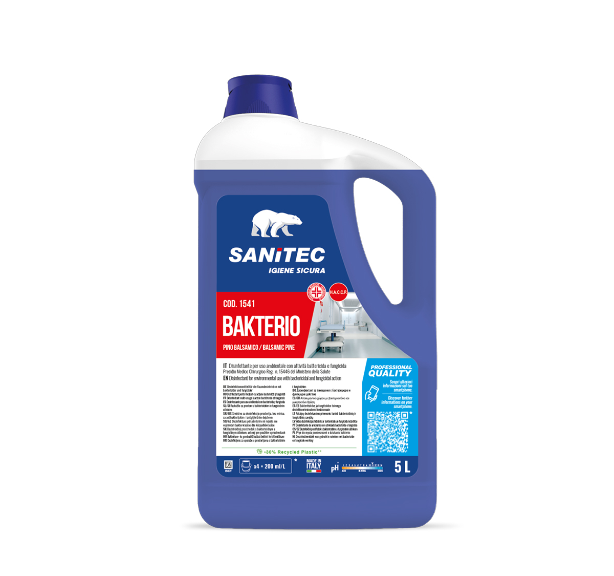 Use a solution of BAKTERIO® with a cloth or sponge soaked in the solution to disinfect, clean and freshen environments and objects in hotels, canteens, industrial environments, schools, care homes, etc. USE DILUTIONS • To deep-disinfect and powerfully freshen bathrooms, sinks, walls, floors, tiles, waste bins, toilet bowls and other surfaces that may harbour germs, dilute BAKTERIO® in water to 20% and leave to work for 15 minutes. • For ordinary disinfection and cleaning of bathrooms, sinks, walls, floors, tiles, doors, door frames and other washable surfaces dilute BAKTERIO® in a 1-3% solution in water and leave to work for 5 minutes.