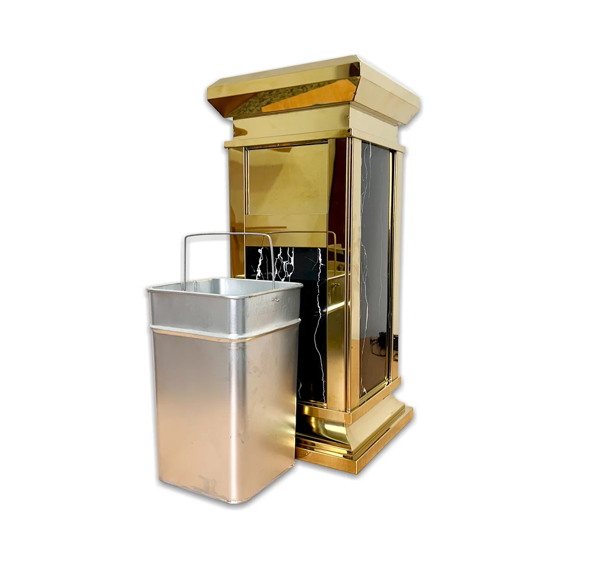 Elevate the look of your hotel, office, or commercial space with our Luxury Marble Waste Bin with Golden Metal Base & Ashtray. Designed with both style and functionality in mind, this premium trash can combines a sleek imitation marble finish with a durable titanium gold stainless steel frame, creating a modern, upscale aesthetic perfect for lobbies, hallways, elevators, and luxury restrooms.